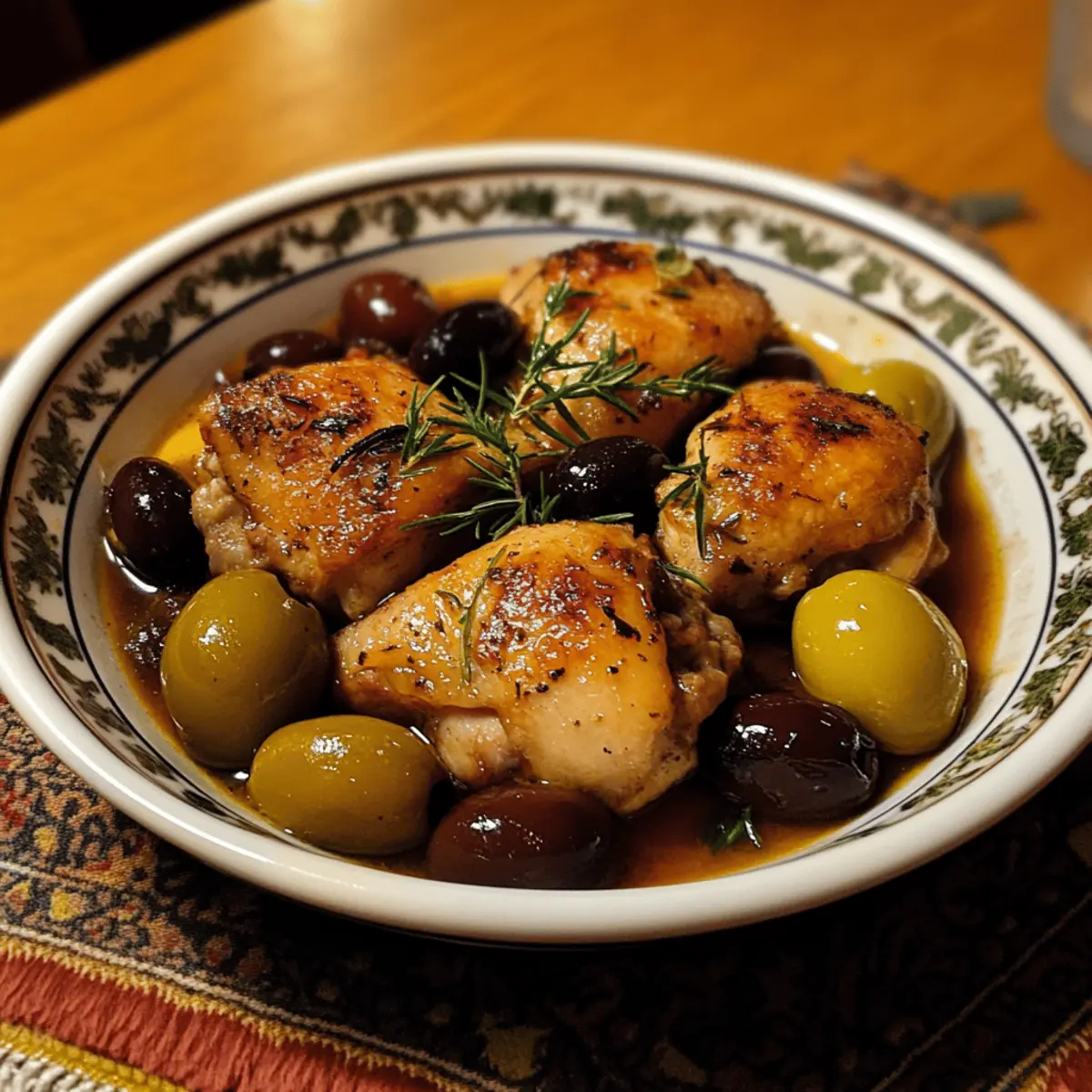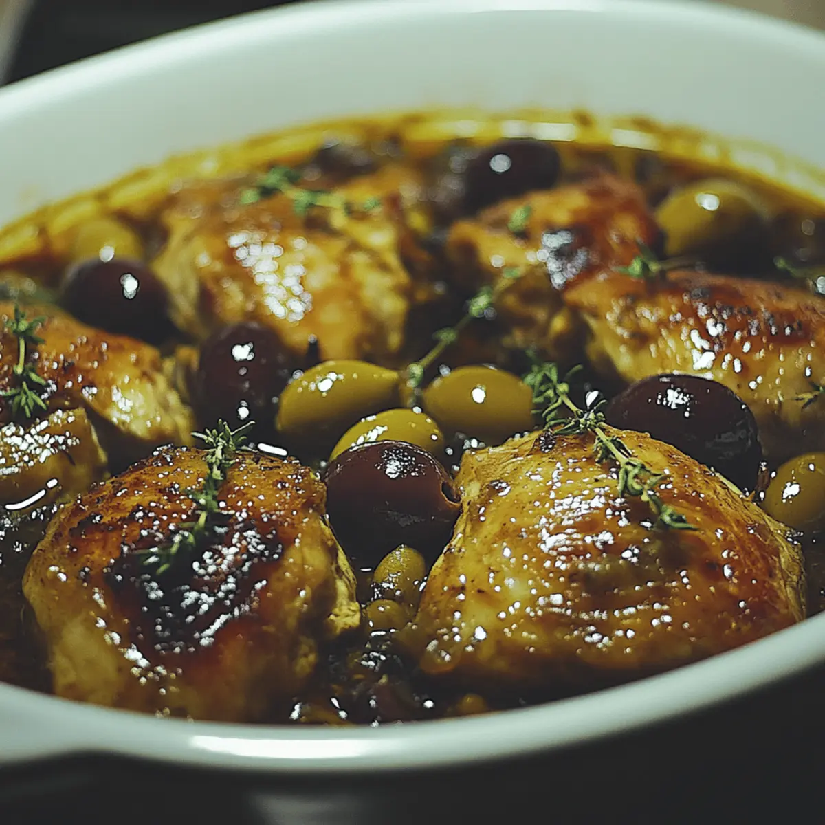 - Add Olives & Herbs: Stir in the green and black olives, fresh thyme, and rosemary. Nestle the chicken thighs back into the braising liquid, skin-side up, arranging evenly.