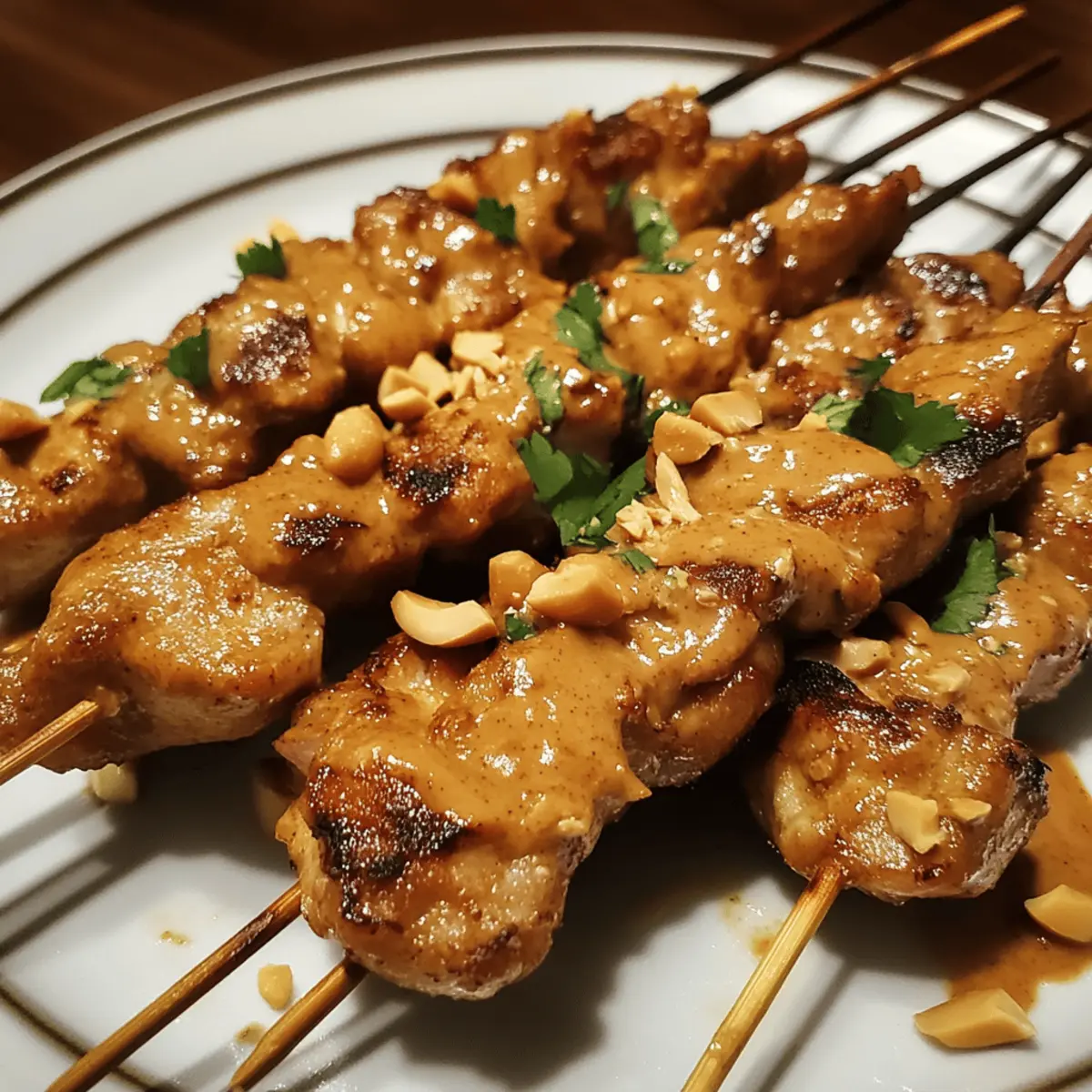 - Arrange skewers on a platter, spoon peanut sauce over or serve alongside. Garnish with fresh cilantro, crushed peanuts, and lime wedges.
