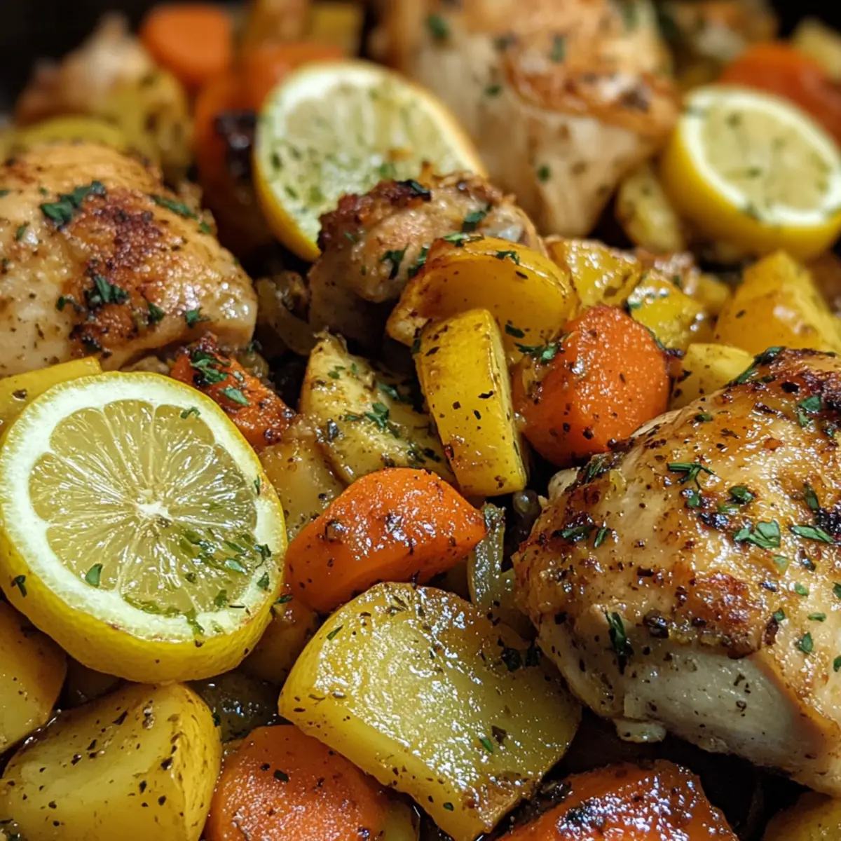 Garnish & Serve: Finally, sprinkle fresh herbs and lemon slices over the top, then plate the juicy, herb-infused chicken and vegetables alongside cooking juices.