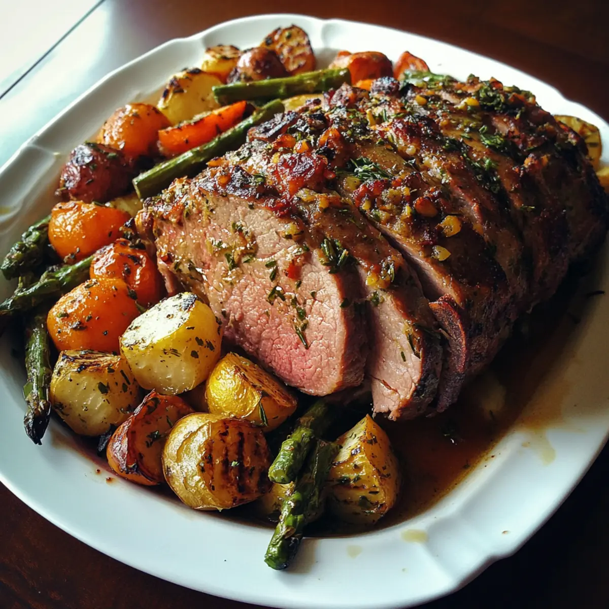 - Slice lamb against the grain into thick slices. Arrange vegetables around meat, drizzle with pan juices. Garnish with fresh parsley and lemon wedges for extra brightness.
