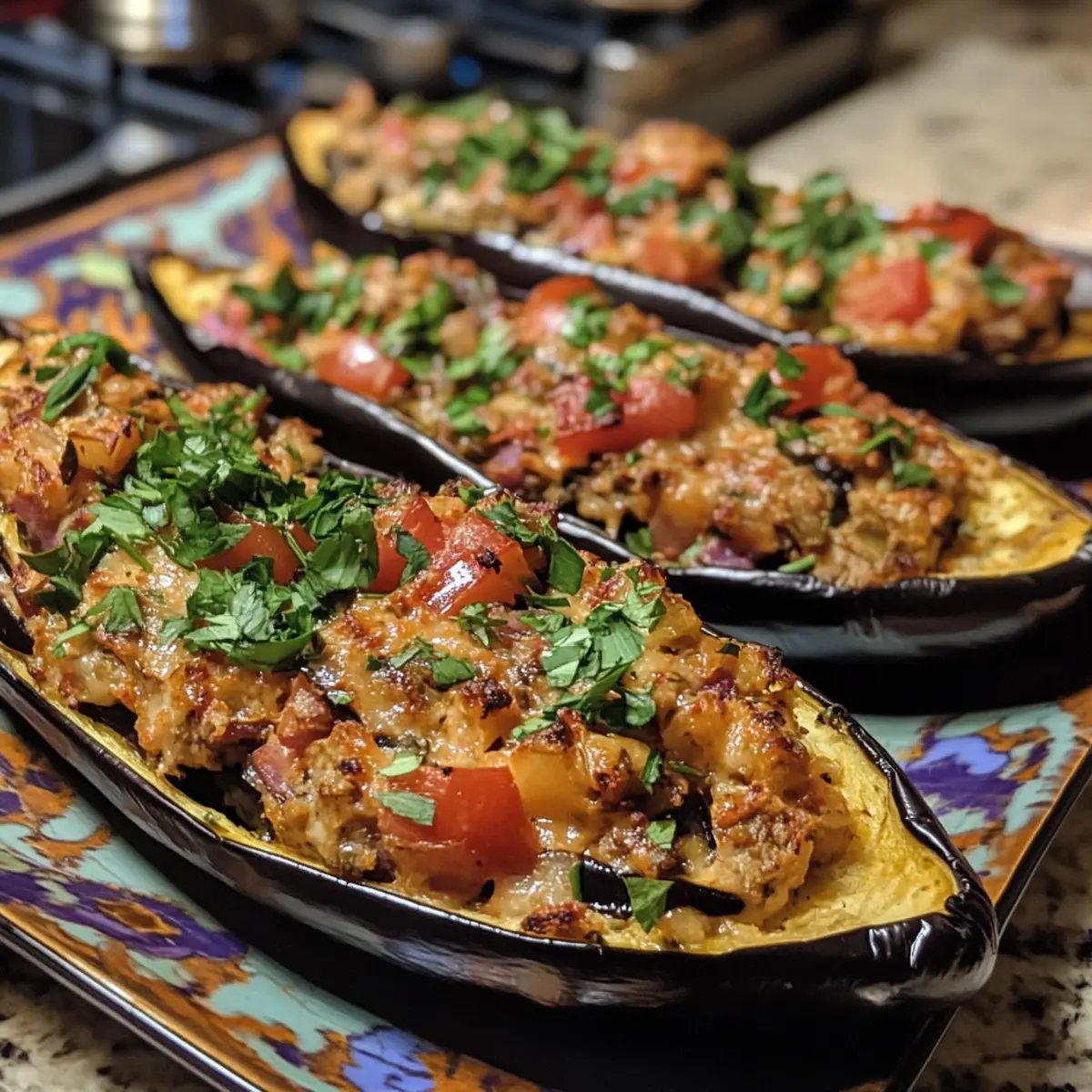 - Combine & Fill: Remove skillet from heat, stir in chopped parsley and creamy feta; spoon the vibrant mixture into warm eggplant shells, mounding generously to fill each boat.
