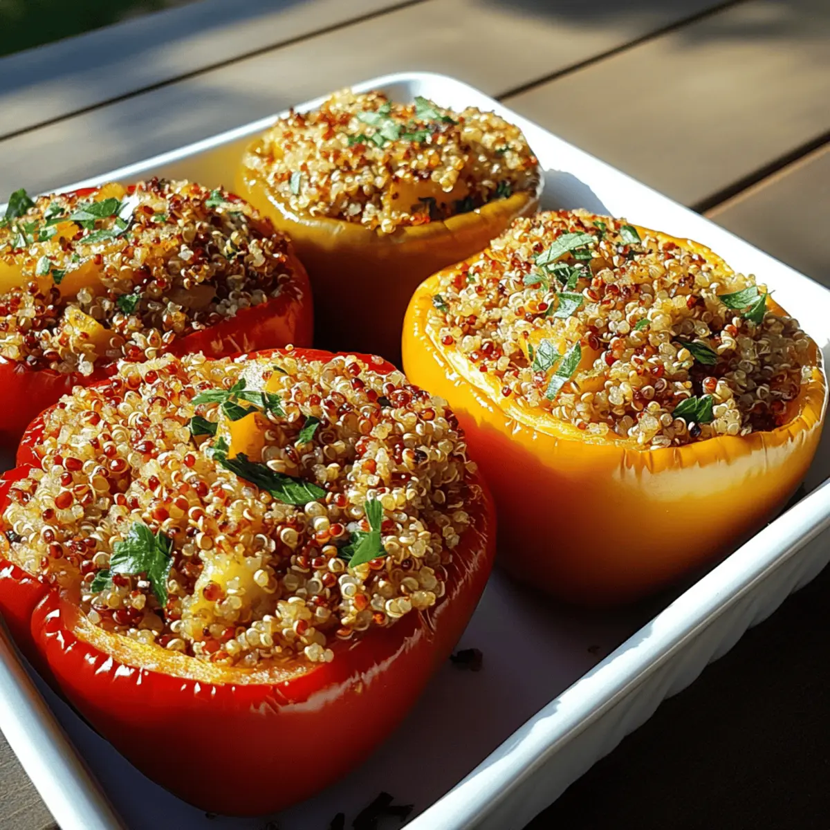 - Stuff Peppers: Spoon the quinoa and veggie mixture into each pepper cavity, pressing gently to fill, and arrange them upright in a baking dish to ensure even cooking and presentation.