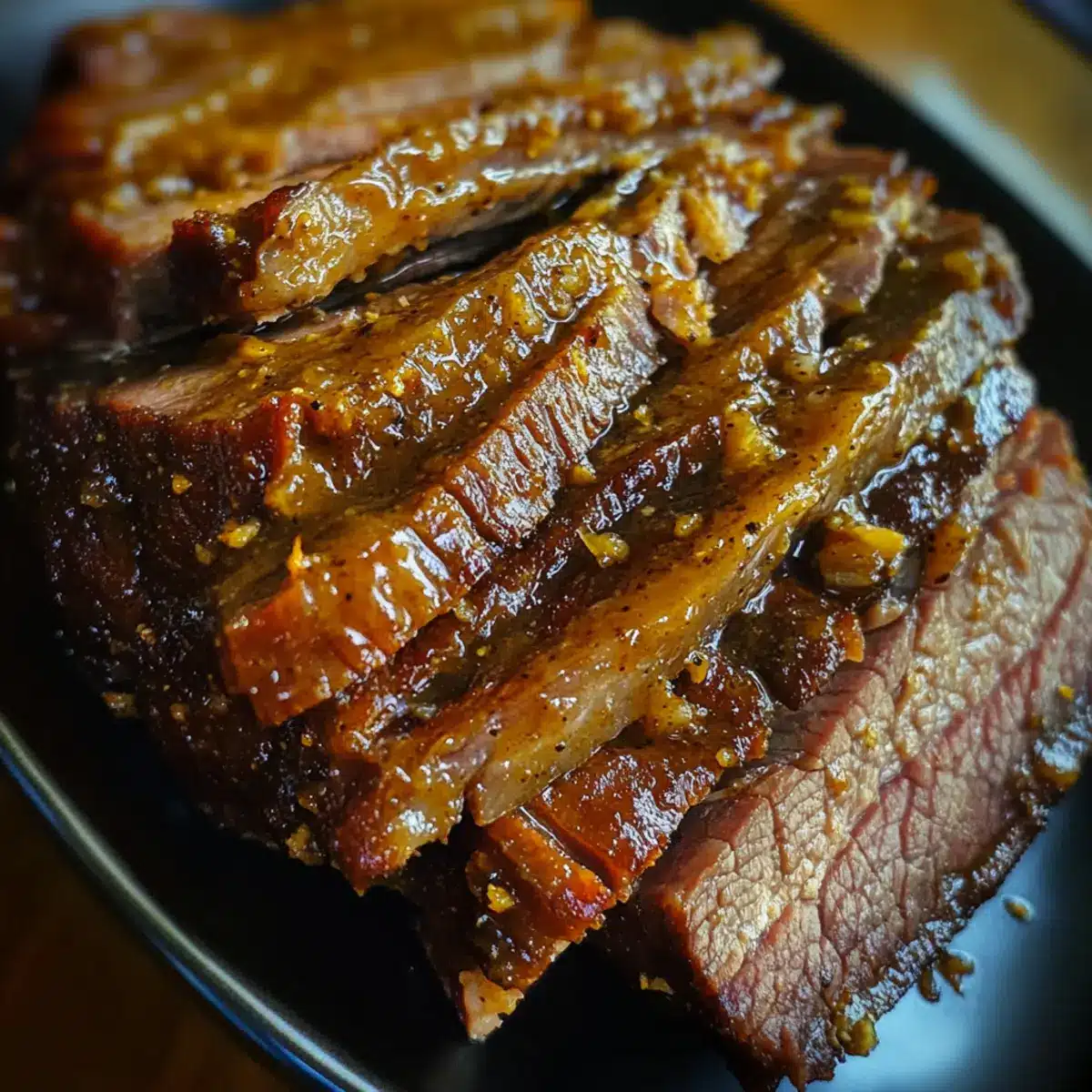 Reheating: To reheat, place the brisket in a covered oven-safe dish at 300°F for about 20-30 minutes, basting with any remaining glaze to enhance moisture and flavor.