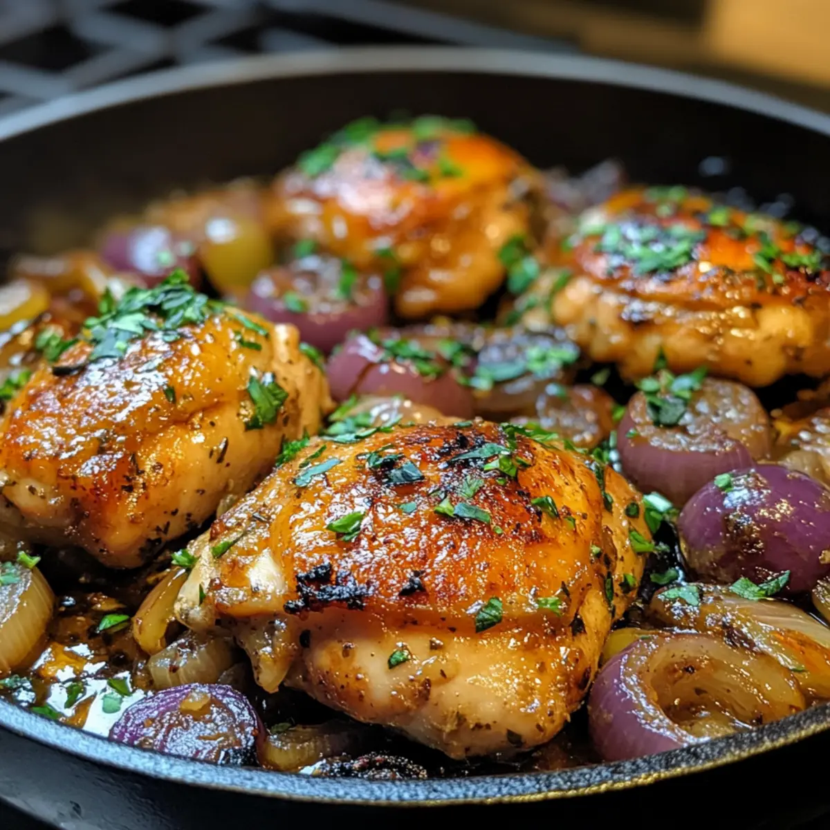 - Rest and Serve: Transfer chicken to a plate, let rest 5 minutes, spoon onions and sauce over thighs. Garnish with lemon juice and fresh thyme leaves.