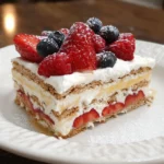 Of all the summer desserts that have graced my family’s table, none disappear quite as quickly or gather as many compliments as this No-Bake Berry Icebox Cake. I first made it on a sweltering July afternoon when the thought of turning on the oven was simply unbearable. I was skeptical. Could something so simple—layers of graham crackers, a creamy filling, and fresh berries—truly be a showstopper? The answer was a resounding yes. My kids, who are usually picky about fruit in their desserts, devoured their slices and asked for seconds. My husband, a man of few words, declared it “the perfect summer cake.” It’s since become our go-to for everything from backyard barbecues to potlucks and birthday celebrations. The magic lies in its transformation in the refrigerator; the crisp crackers soften into a tender, cake-like texture, melding perfectly with the sweet, tangy cream and the juicy burst of fresh berries. It’s a dessert that tastes like a labor of love but is, secretly, one of the easiest things you’ll ever make.