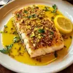 The aroma alone was enough to tell me this Pistachio-Crusted Cod with Lemon Butter Sauce was going to be a winner. From the moment I pulled the glistening cod fillets from the oven, their golden pistachio crust whispering promises of nutty flavor and tender flakiness, I knew I had stumbled upon a recipe that would quickly become a family favorite. And I wasn’t wrong! Dinner that night was met with enthusiastic murmurs of approval from everyone around the table, even my notoriously picky youngest declared it “the best fish ever!” The bright, zesty lemon butter sauce drizzled over the crispy cod and vibrant green pistachios was a symphony of flavors and textures that elevated a simple weeknight meal into something truly special. This recipe is not only incredibly delicious but also surprisingly easy to prepare, making it perfect for busy weeknights or elegant enough for a weekend dinner party. If you’re looking for a way to fall in love with cod, or simply want a healthy and flavorful seafood dish that will impress, look no further. This Pistachio-Crusted Cod with Lemon Butter Sauce is your answer.