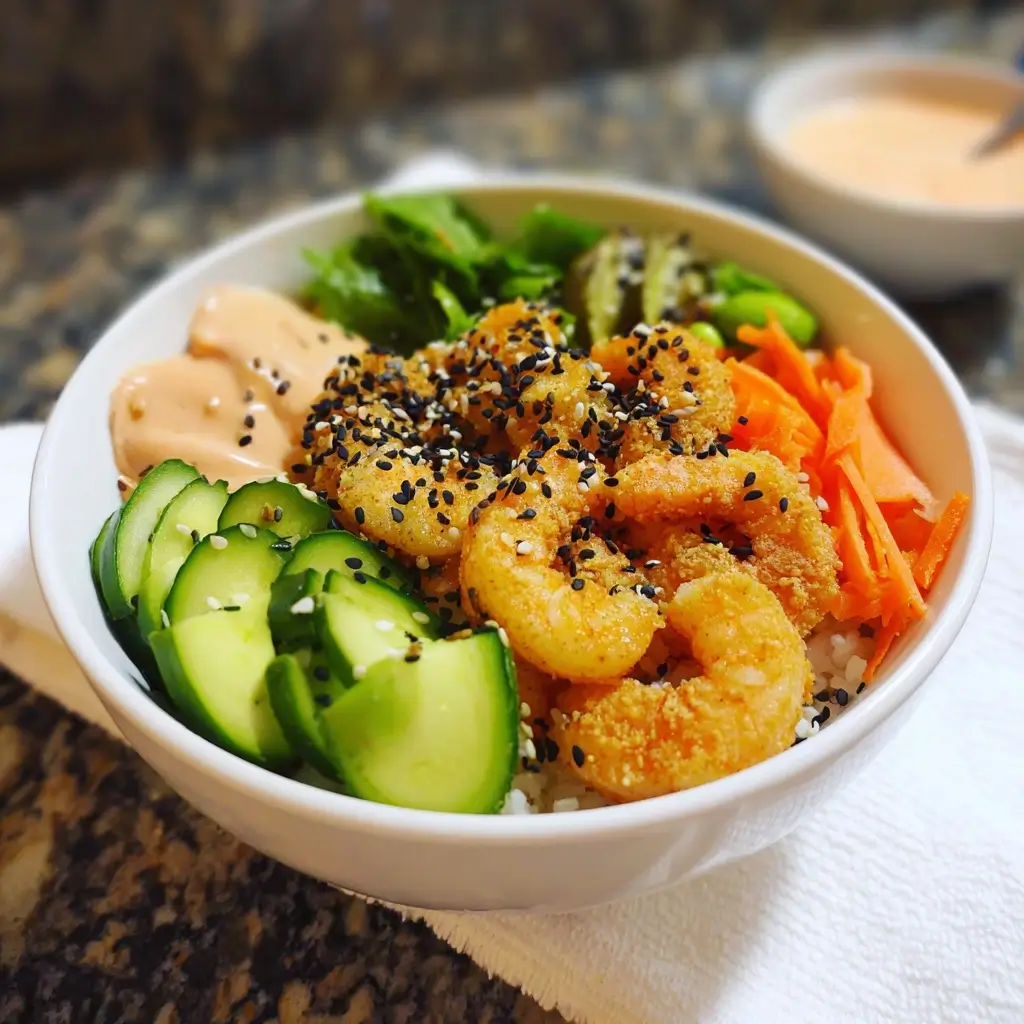 - Endlessly Customizable: This recipe is a fantastic template, not a strict set of rules. You are the artist, and the bowl is your canvas. Don’t like shrimp? Swap it for seared salmon or tofu. Not a fan of cucumber? Use bell peppers or radishes instead. You can adjust the spice level in the mayo, add different sauces, or even change the base to quinoa or mixed greens. It’s a wonderful way to use up leftover vegetables in your fridge and cater to the specific tastes of everyone in your family.